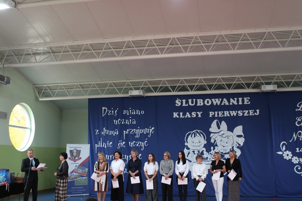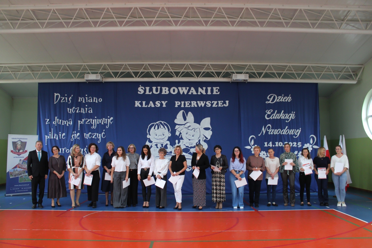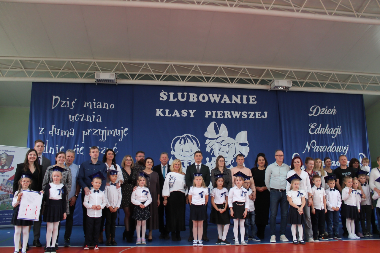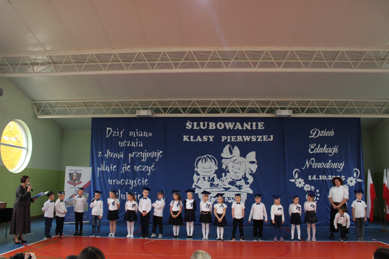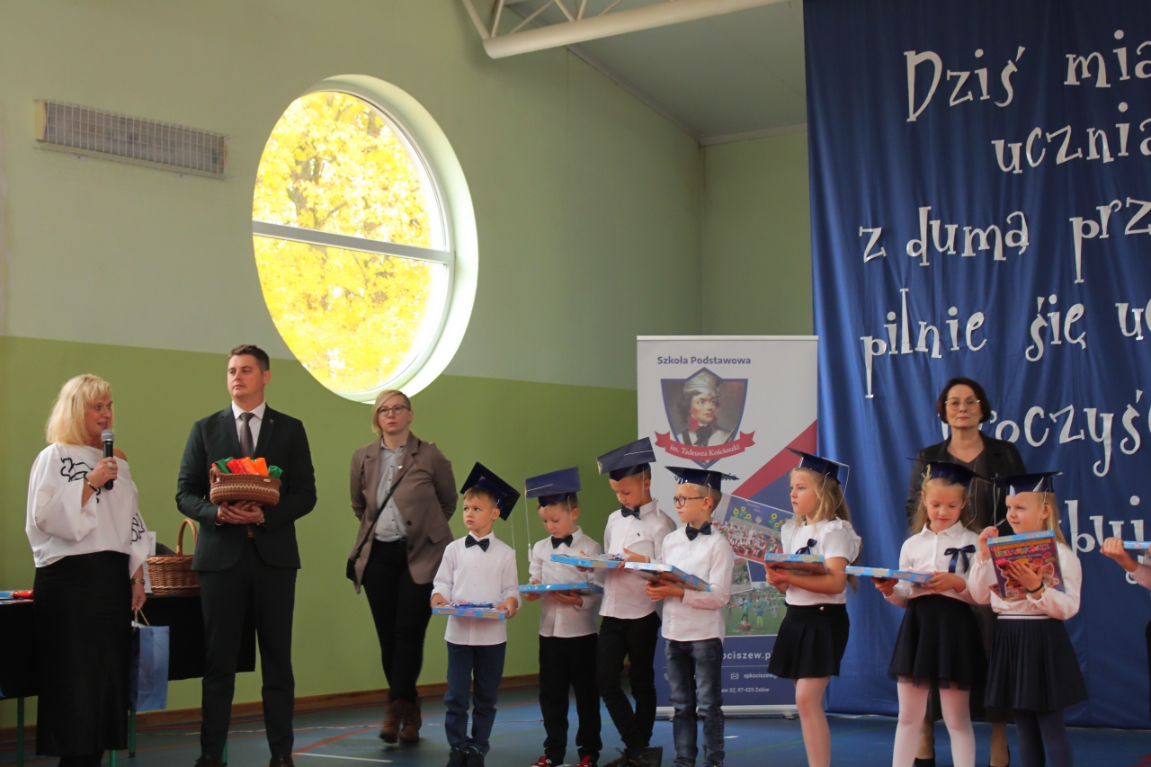 14 października w naszej szkole , to podwójne święto. Dzień Edukacji Narodowej oraz pasowanie- włączenie do grona naszej społeczności uczniów klasy pierwszej. Uroczystość zaszczycili swoją obecnością: Burmistrz Miasta Zelowa – pan Kamil Świtała, radna – pani Barbara Walczak, przewodnicząca Rady Rodziców- pani Anna Jóźwiak oraz pani Iza Klich- bibliotekarka z biblioteki w Kociszewie. Dzieci z klasy pierwszej przedstawiły krótką inscenizację, podczas której rozważały dylemat:” A może by tak zostać dyrektorem?”. Chór pod kierownictwem pani Agnieszki Młynarczyk zaśpiewał piosenki tematycznie związane z obchodzonymi świętami. Występy zakończono zabawą muzyczno- ruchową:” Przyszła jesień do parku, kasztanki zrzuciła”…… Dzieci złożyły uroczyste przyrzeczenie, a dyrektor pan Jacek Malinowski dokonał pasowania. Wręczono upominki i legitymacje szkolne. Uczniowie klasy drugiej przywitali pierwszoklasistów i zaprosili do szkolnej wspólnoty. Przedstawiciele rodziców pięknie podziękowali dyrektorowi, wychowawczyni i nauczycielom za opiekę i włożoną pracę. Dalej- wręczono nagrody nauczycielom i pracownikom szkoły. Spotkanie zakończono poczęstunkiem i rozmowami przy herbacie i kawie. Wszystkim obecnym serdecznie dziękujemy, a Pani Ilonie Grzelak za przygotowanie przedszkolaków i Pani Bożenie Kryzie za pękną dekorację.