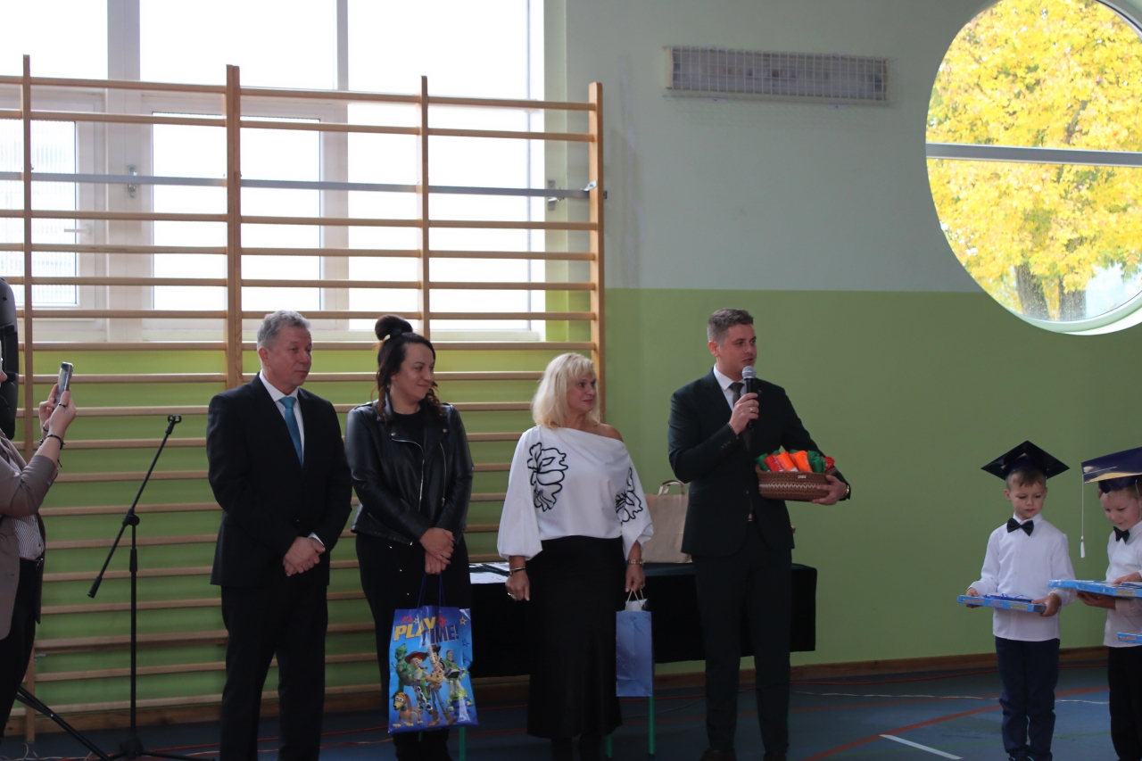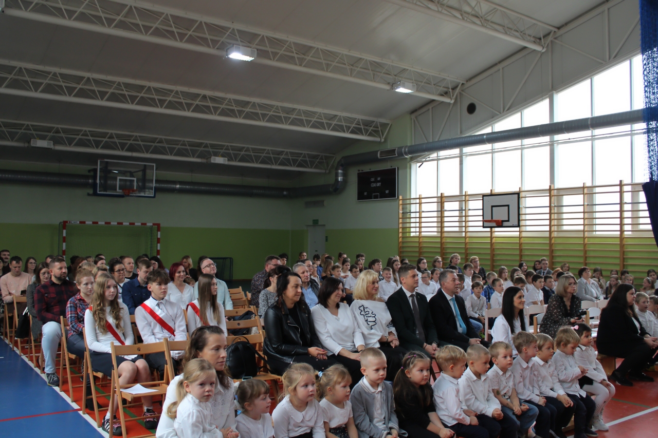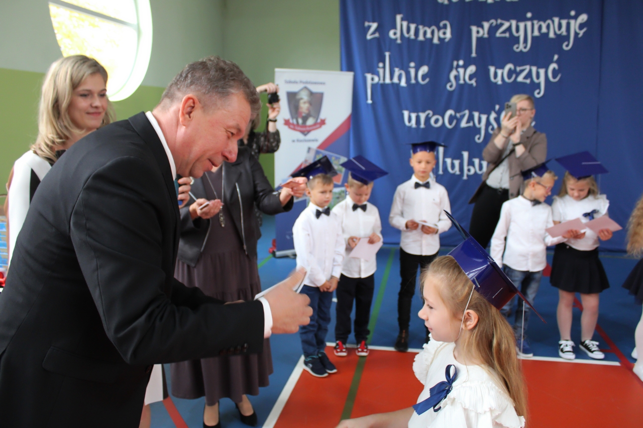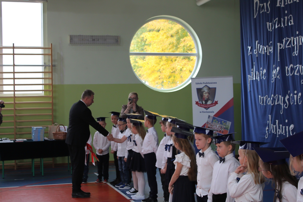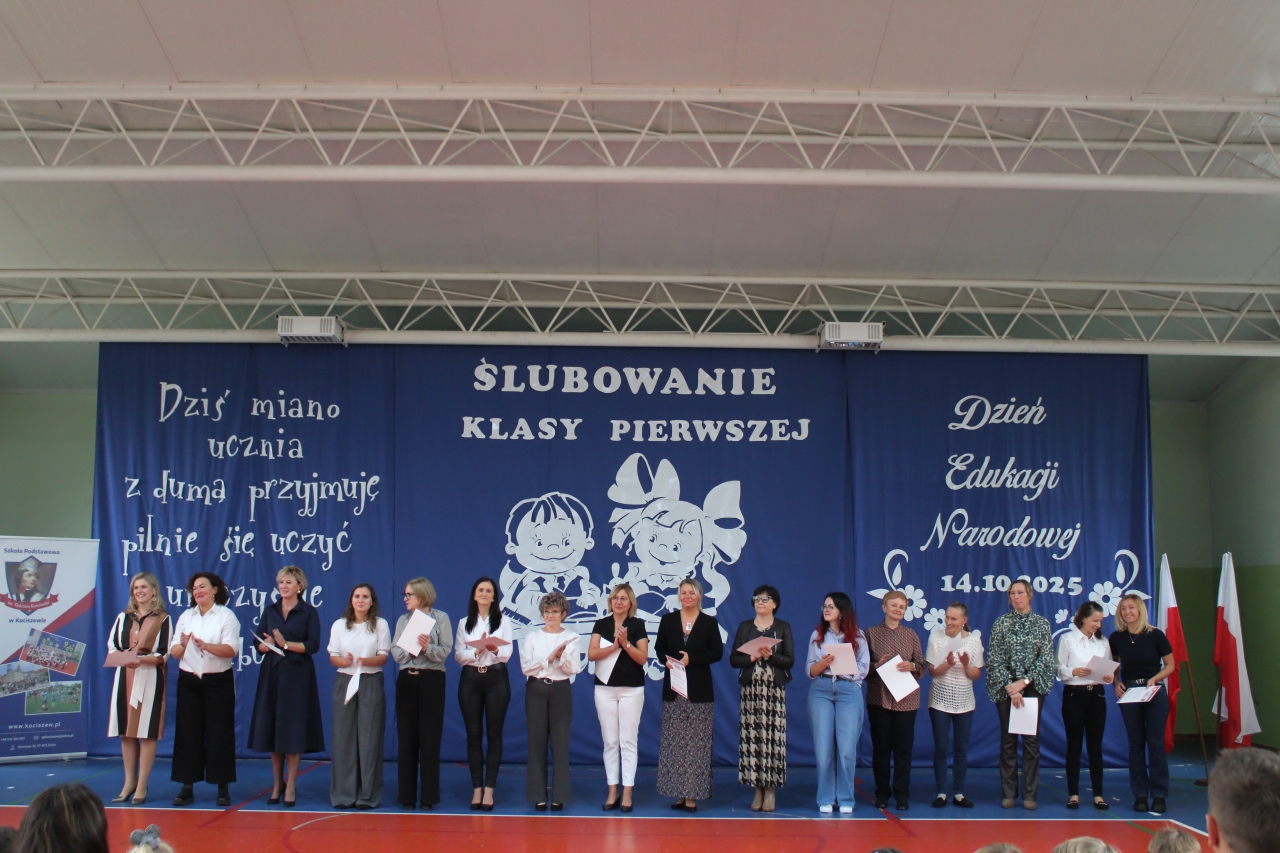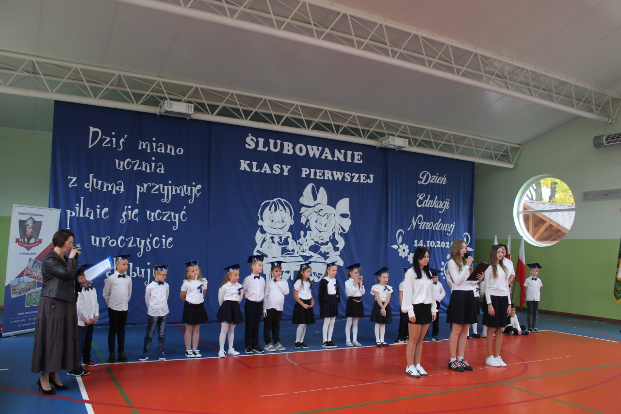 14 października w naszej szkole , to podwójne święto. Dzień Edukacji Narodowej oraz pasowanie- włączenie do grona naszej społeczności uczniów klasy pierwszej. Uroczystość zaszczycili swoją obecnością: Burmistrz Miasta Zelowa – pan Kamil Świtała, radna – pani Barbara Walczak, przewodnicząca Rady Rodziców- pani Anna Jóźwiak oraz pani Iza Klich- bibliotekarka z biblioteki w Kociszewie. Dzieci z klasy pierwszej przedstawiły krótką inscenizację, podczas której rozważały dylemat:” A może by tak zostać dyrektorem?”. Chór pod kierownictwem pani Agnieszki Młynarczyk zaśpiewał piosenki tematycznie związane z obchodzonymi świętami. Występy zakończono zabawą muzyczno- ruchową:” Przyszła jesień do parku, kasztanki zrzuciła”…… Dzieci złożyły uroczyste przyrzeczenie, a dyrektor pan Jacek Malinowski dokonał pasowania. Wręczono upominki i legitymacje szkolne. Uczniowie klasy drugiej przywitali pierwszoklasistów i zaprosili do szkolnej wspólnoty. Przedstawiciele rodziców pięknie podziękowali dyrektorowi, wychowawczyni i nauczycielom za opiekę i włożoną pracę. Dalej- wręczono nagrody nauczycielom i pracownikom szkoły. Spotkanie zakończono poczęstunkiem i rozmowami przy herbacie i kawie. Wszystkim obecnym serdecznie dziękujemy, a Pani Ilonie Grzelak za przygotowanie przedszkolaków i Pani Bożenie Kryzie za pękną dekorację.
